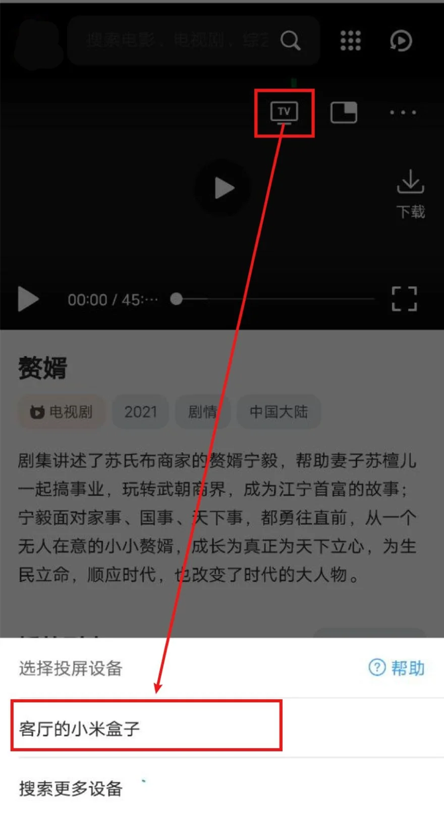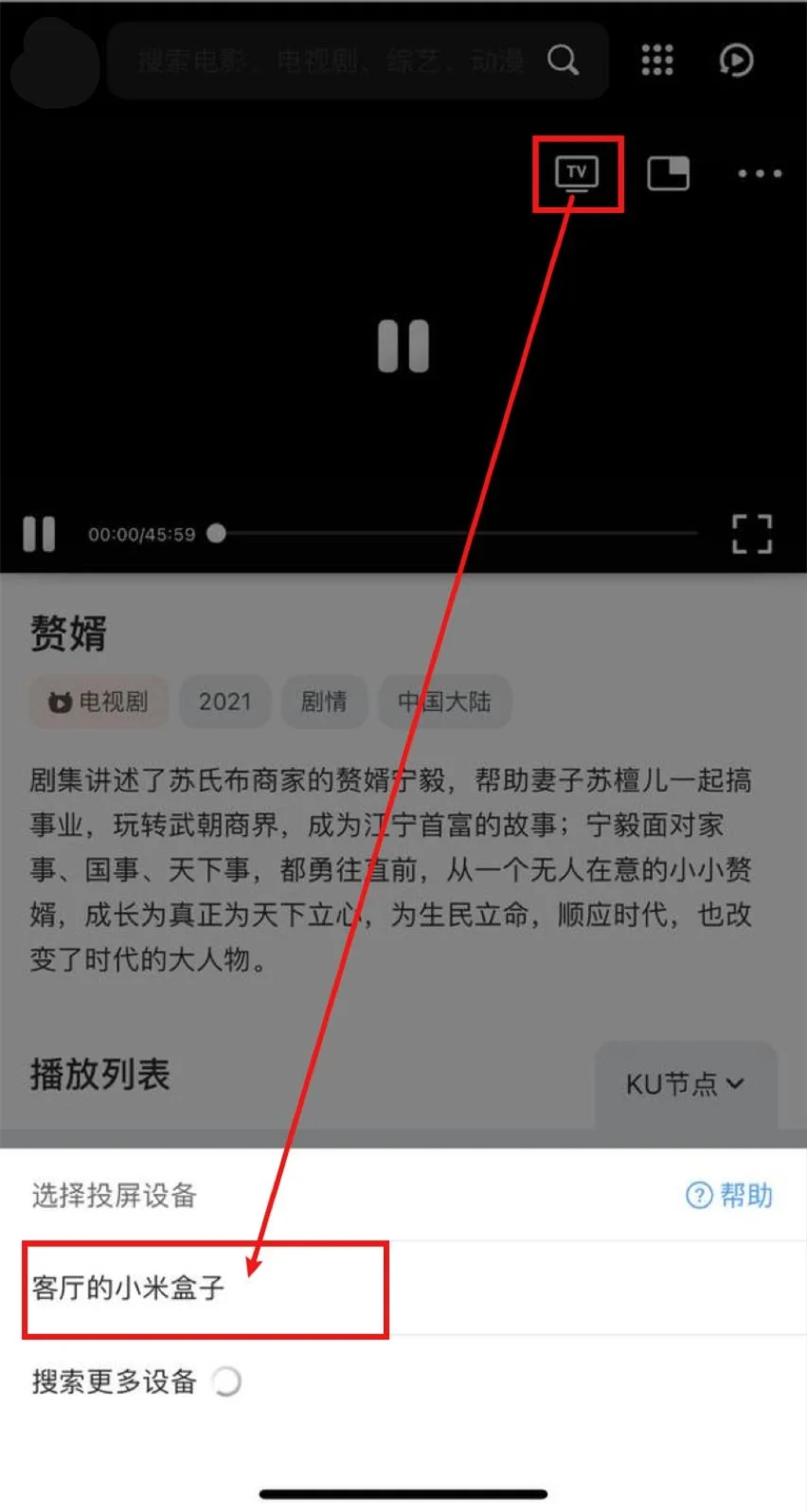 打开QQ浏览器(会接管网页播放器)->打开LingMovie->播放视频->选中投屏图标->等待搜寻出智能电视/电视盒子->选中,即可投屏。